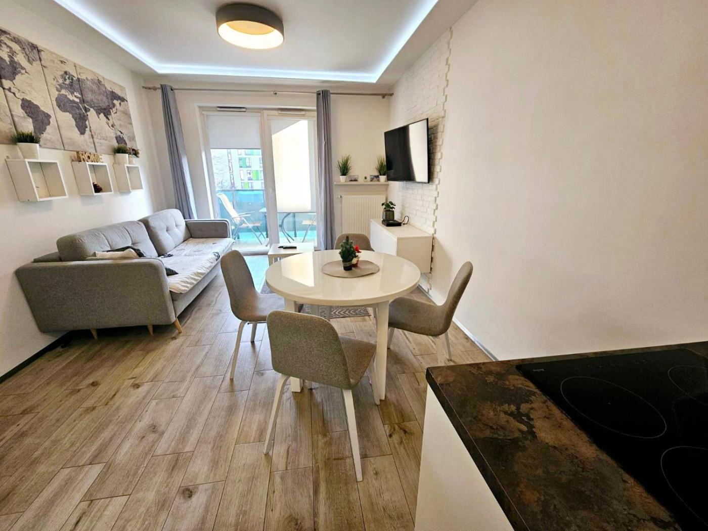 Apartament z 1 sypialnią. This apartments standout feature is the fireplace. This apartment includes 1 living room, 1 separate bedroom and 1 bathroom with a shower and free toiletries. In the well-equipped kitchenette, guests will find a stovetop, a dishwasher, kitchenware and an oven. The apartment offers a washing machine, soundproof walls, a seating area, a flat-screen TV with streaming services, as well as garden views. The unit has 2 beds. Apartament - 6 osobowy. Powierzchnia pokoju ok.: 42 mkw.